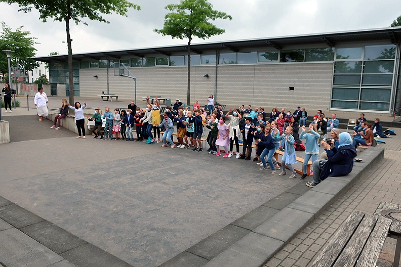 Wegen Corona hatte jede Klasse draußen eine eigene kleine Abschiedsfeier, immer begleitet von einer Aufführung einer dritten Klasse. Zum Glück spielte das Wetter mit , so dass jede Klasse seinen stimmungsvollen Abschluss bekam – wie die Fotos zeigen.