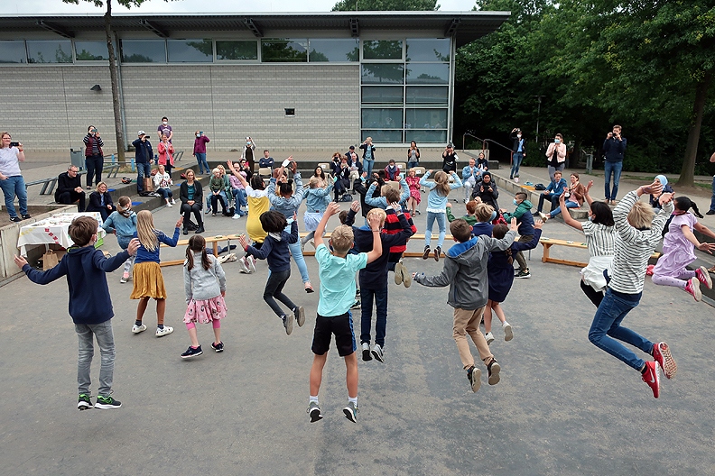 Wegen Corona hatte jede Klasse draußen eine eigene kleine Abschiedsfeier, immer begleitet von einer Aufführung einer dritten Klasse. Zum Glück spielte das Wetter mit , so dass jede Klasse seinen stimmungsvollen Abschluss bekam – wie die Fotos zeigen.