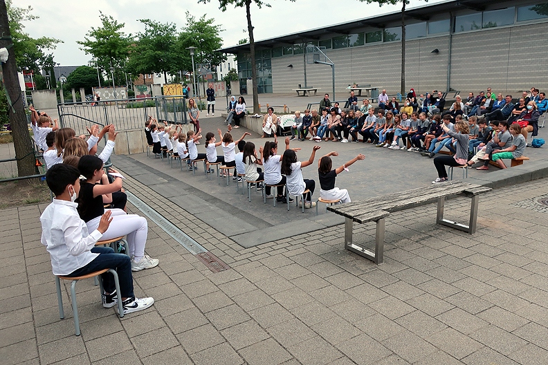 Wegen Corona hatte jede Klasse draußen eine eigene kleine Abschiedsfeier, immer begleitet von einer Aufführung einer dritten Klasse. Zum Glück spielte das Wetter mit , so dass jede Klasse seinen stimmungsvollen Abschluss bekam – wie die Fotos zeigen.
