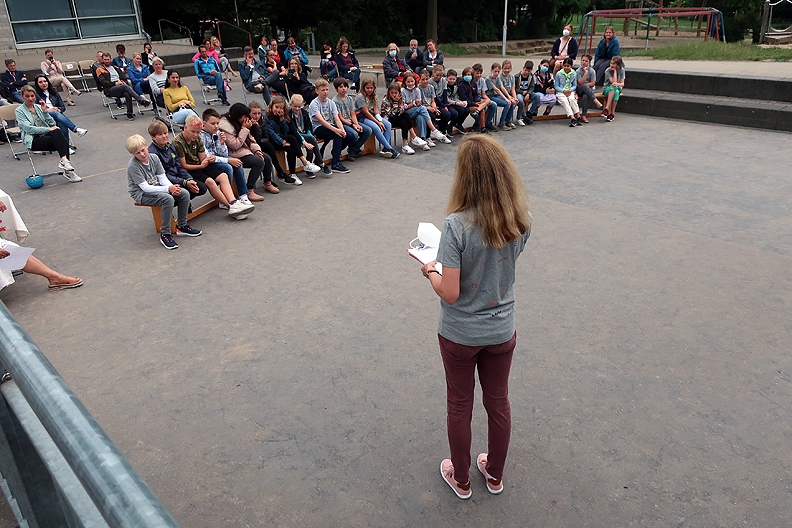 Wegen Corona hatte jede Klasse draußen eine eigene kleine Abschiedsfeier, immer begleitet von einer Aufführung einer dritten Klasse. Zum Glück spielte das Wetter mit , so dass jede Klasse seinen stimmungsvollen Abschluss bekam – wie die Fotos zeigen.