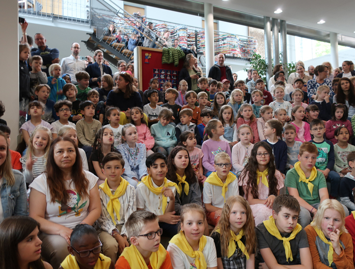 Freitag, der 05.07.24, eine schöner, aber auch etwas trauriger Tag an der Mosaik-Schule: Wir feiern den Start der Sommerferien, wir verabschieden uns aber auch zugleich von den Kindern der 4. Klassen und einigen KollegInnen. Das wollten sich viele Eltern und weitere Gäste natürlich nicht entgehen lassen. Entsprechend voll war es im Forum.