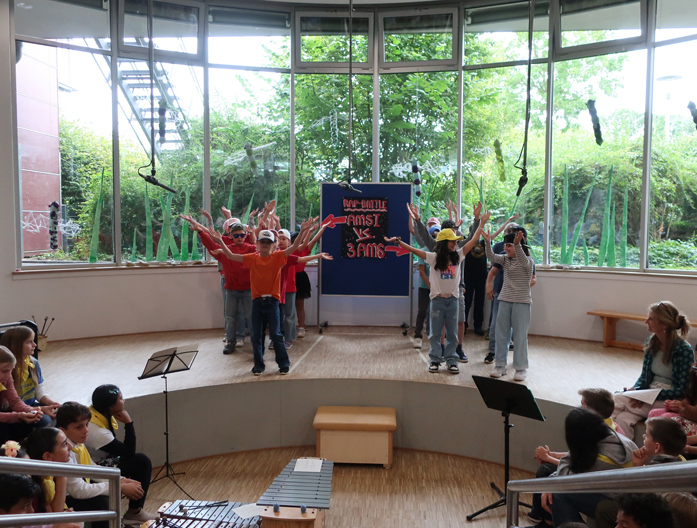 Freitag, der 05.07.24, eine schöner, aber auch etwas trauriger Tag an der Mosaik-Schule: Wir feiern den Start der Sommerferien, wir verabschieden uns aber auch zugleich von den Kindern der 4. Klassen und einigen KollegInnen. Das wollten sich viele Eltern und weitere Gäste natürlich nicht entgehen lassen. Entsprechend voll war es im Forum.