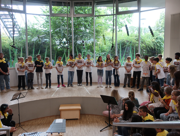 Freitag, der 05.07.24, eine schöner, aber auch etwas trauriger Tag an der Mosaik-Schule: Wir feiern den Start der Sommerferien, wir verabschieden uns aber auch zugleich von den Kindern der 4. Klassen und einigen KollegInnen. Das wollten sich viele Eltern und weitere Gäste natürlich nicht entgehen lassen. Entsprechend voll war es im Forum.