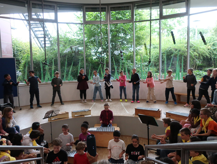 Freitag, der 05.07.24, eine schöner, aber auch etwas trauriger Tag an der Mosaik-Schule: Wir feiern den Start der Sommerferien, wir verabschieden uns aber auch zugleich von den Kindern der 4. Klassen und einigen KollegInnen. Das wollten sich viele Eltern und weitere Gäste natürlich nicht entgehen lassen. Entsprechend voll war es im Forum.