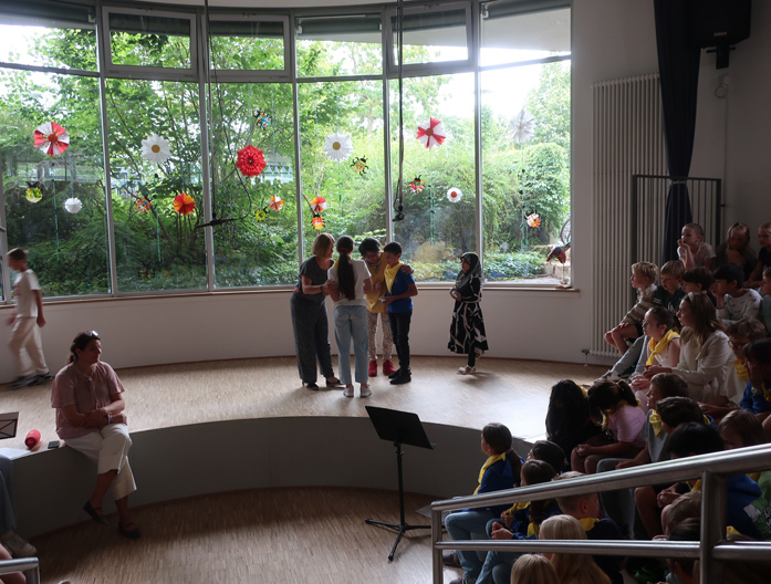 Bereits am Morgen wurden die Viertklässler besonders von Ihrer Klassenlehrerin begrüßt, sie bekamen als Erkennungszeichen ein gelbes Tuch umgebunden. Nach zwei letzten Stunden in der Klasse starteten wir dann im Forum mit der großen Feier. Schön, dass so viele Gäste zum Feiertag gekommen sind. Es war ganz schön voll.