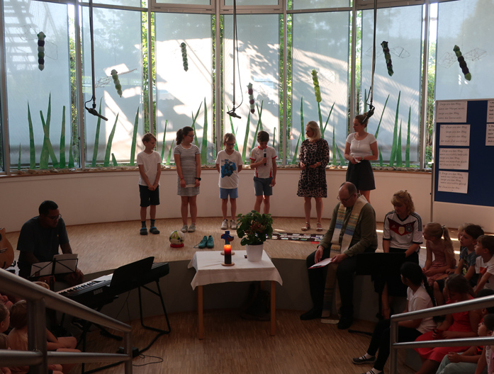 Am Donnerstag, den 27.06.24, feierten wir im Forum unseren ökumenischen Abschlussgottesdienst für das Schuljahr 2024/25. Vorbereitet hatten die Gottesdienst die Lehrerinnen der Mosaik-Schule. Pfarrerin Jürgens und Pfarrer Sühling gaben dem Ganzen zudem ein aktuelle Note mit dem Motto „Abpfiff“!