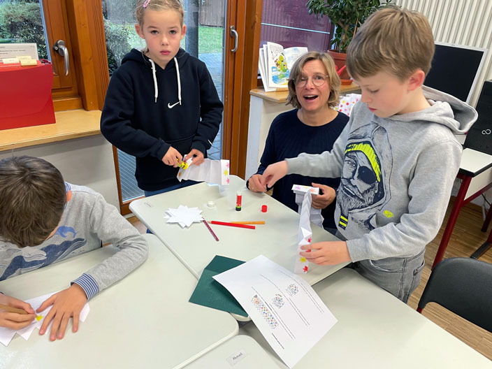 Der Basteltag war super. Wir haben erstmal alles erklärt bekommen. Es gab fünf Stationen und es gab die Sternen-Prickel-Station draußen im Flur. Es gab eine Faltstation. Da hat man Sterne gefaltet. Und es gab noch eine Station, die mit dieser zusammengehörte. Eine Prickel- und eine Ausmalstation gab es noch. Und dann gab es Frühstück und auch noch Waffeln zum Frühstück.