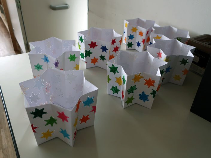 Der Basteltag war super. Wir haben erstmal alles erklärt bekommen. Es gab fünf Stationen und es gab die Sternen-Prickel-Station draußen im Flur. Es gab eine Faltstation. Da hat man Sterne gefaltet. Und es gab noch eine Station, die mit dieser zusammengehörte. Eine Prickel- und eine Ausmalstation gab es noch. Und dann gab es Frühstück und auch noch Waffeln zum Frühstück.