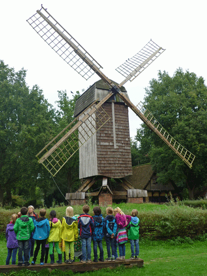 Dann ist Frau Berner mit uns zu einer großen und alten Mühle gegangen. Diese Mühle hat sich aber nicht gedreht, weil es keinen starken Wind gab und die Mühlensegel nicht drauf gespannt waren. Anschließend haben wir uns einen alten Mühlstein angesehen. Der Mühlstein hatte kleine Rillen.