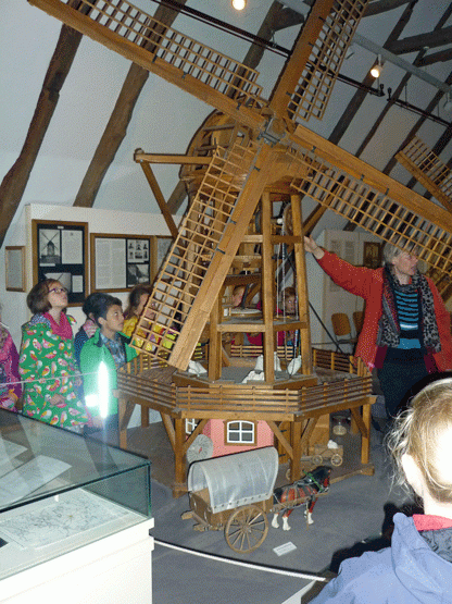Wir sind dann in ein Haus gegangen und haben Mühlenmodelle angeguckt. Dort gab es eine Kappenwindmühle, eine Bockwindmühle, eine Wassermühle und eine Schiffsmühle.