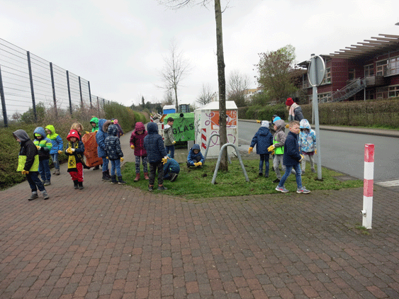 Morgens starteten wir mit einem Gottesdienst zum Thema „Bewahrung der Schöpfung“. Nach einer Klassenzeit und der großen Pause machten sich alle – trotz des schlechten Wetters – auf, um rund um die Schule Müll zu sammeln.