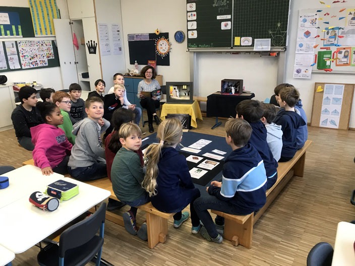Bis einschließlich Donnerstag können sich die Kinder jeden Morgen ein Leseprojekt aussuchen. Daran arbeiten sie dann zwei Schulstunden, dieses Jahr immer in der 3. und 4. Stunde. Und dort wird nicht nur gelesen, sondern immer anschließend auch etwas gemacht, z.B. ein Stabpuppenspiel, Bewegungsstationen in der Turnhalle, Bilder malen, Texte weiterschreiben, Verkleidungen erproben, Traumgläser erstellen …..