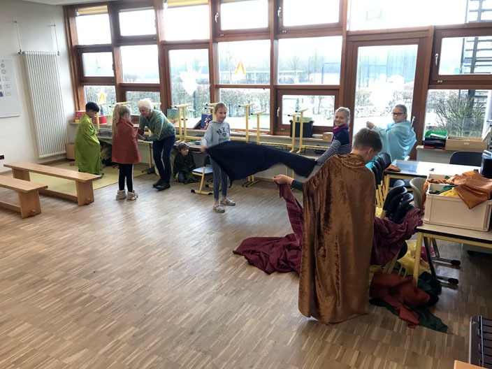 Bis einschließlich Donnerstag können sich die Kinder jeden Morgen ein Leseprojekt aussuchen. Daran arbeiten sie dann zwei Schulstunden, dieses Jahr immer in der 3. und 4. Stunde. Und dort wird nicht nur gelesen, sondern immer anschließend auch etwas gemacht, z.B. ein Stabpuppenspiel, Bewegungsstationen in der Turnhalle, Bilder malen, Texte weiterschreiben, Verkleidungen erproben, Traumgläser erstellen …..
