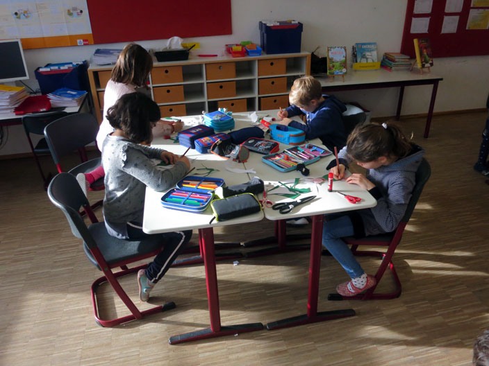 Bis einschließlich Donnerstag können sich die Kinder jeden Morgen ein Leseprojekt aussuchen. Daran arbeiten sie dann zwei Schulstunden, dieses Jahr immer in der 3. und 4. Stunde. Und dort wird nicht nur gelesen, sondern immer anschließend auch etwas gemacht, z.B. ein Stabpuppenspiel, Bewegungsstationen in der Turnhalle, Bilder malen, Texte weiterschreiben, Verkleidungen erproben, Traumgläser erstellen …..