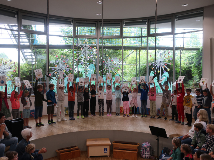 Gestartet sind wir um 8:15 mit einem ökumenischen Gottesdienst. Danach wurden die Kinder von ihren Klassenlehrerinnen auf dem Schulhof mit einer Sonnen-Kette begrüßt. Zusammen gingen sie dann ins Forum für die eigentliche Einschulungsfeier. Die Feier hatten die Klassen 2 vorbereitet. Für die Probe hatten die Kinder nur den Montag Zeit. Und sie haben das toll gemacht. Danke dafür!