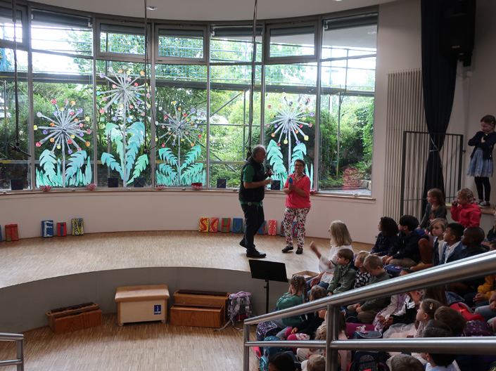 Gestartet sind wir um 8:15 mit einem ökumenischen Gottesdienst. Danach wurden die Kinder von ihren Klassenlehrerinnen auf dem Schulhof mit einer Sonnen-Kette begrüßt. Zusammen gingen sie dann ins Forum für die eigentliche Einschulungsfeier. Die Feier hatten die Klassen 2 vorbereitet. Für die Probe hatten die Kinder nur den Montag Zeit. Und sie haben das toll gemacht. Danke dafür!