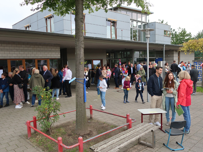 Gestartet sind wir um 8:15 mit einem ökumenischen Gottesdienst. Danach wurden die Kinder von ihren Klassenlehrerinnen auf dem Schulhof mit einer Sonnen-Kette begrüßt. Zusammen gingen sie dann ins Forum für die eigentliche Einschulungsfeier. Die Feier hatten die Klassen 2 vorbereitet. Für die Probe hatten die Kinder nur den Montag Zeit. Und sie haben das toll gemacht. Danke dafür!