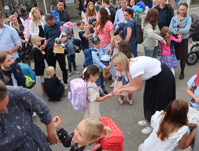 Danach trafen sich alle auf den Schulhof, wo bereits die Klassenlehrerin wartete. Sie überreichte den ErstklässerInnen ein Begrüßungsgeschenk und ging dann zusammen mit Ihnen ins Forum.