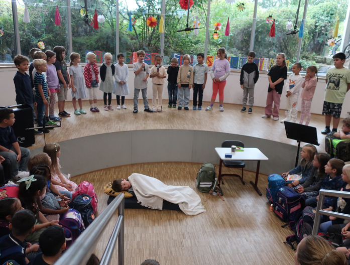 Dort startete dann die Einschulungsfeier, die die Klassen 2 vorbereitet hatten. Und für die Generalprobe hatten die nur 1 Tag Zeit. Großes Dankeschön!