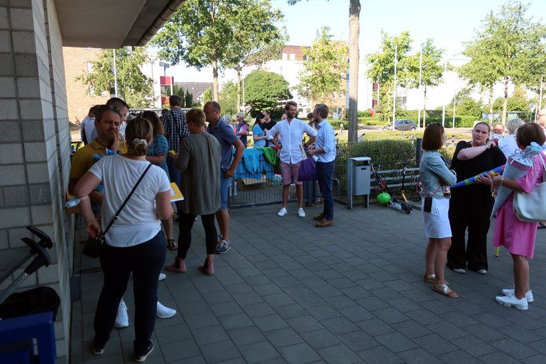Die Eltern gingen in der Zeit nach draußen vor die Schule. Dort wartete der Förderverein – unterstützt von einigen Eltern aus den ehemaligen Klassen 1 – mit Kaltgetränken und Schul-T-Shirts zum Sonderpreis. Großen Dank für die Unterstützung. Außerdem erhielten die Eltern Infos zur nächsten Zeit und konnten Fragen mit der Schulleitung und der Betreuung klären.