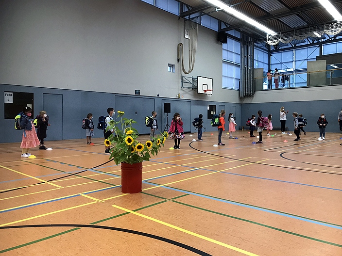 Wegen Corona mussten wir auch dieses Jahr 2021 die Einschulungsfeiern auf zwei Tage verteilen: Am Donnerstag, den 19.08. wurden erst die Kinder der Klasse 1 Wie und danach die Kinder der 1 Ams eingeschult. Am Freitag folgten dann die Kinder der Klasse 1 Brau. Die hatten Glück mit dem Wetter und konnten ihre Einschulungsfeier draußen auf dem Schulhof begehen, während der Regen am Donnerstag uns leider zwang, spontan in die Turnhalle auszuweichen. Aber das hat uns alle nicht davon abgehalten, die Einschulung schön und feierlich zu gestalten.