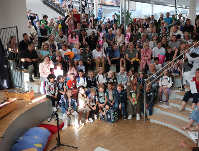 Gestartet wurde mit einem ökumenischen Gottesdienst. Danach fand die Einschulungsfeier statt. Dafür haben die Kinder der alten Klassen 1 vor den Ferien geprobt und hatten jetzt nur noch einen Tag Zeit für die Generalprobe. Und die Kinder haben das toll gemacht.