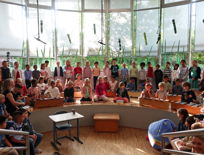 Gestartet wurde mit einem ökumenischen Gottesdienst. Danach fand die Einschulungsfeier statt. Dafür haben die Kinder der alten Klassen 1 vor den Ferien geprobt und hatten jetzt nur noch einen Tag Zeit für die Generalprobe. Und die Kinder haben das toll gemacht.