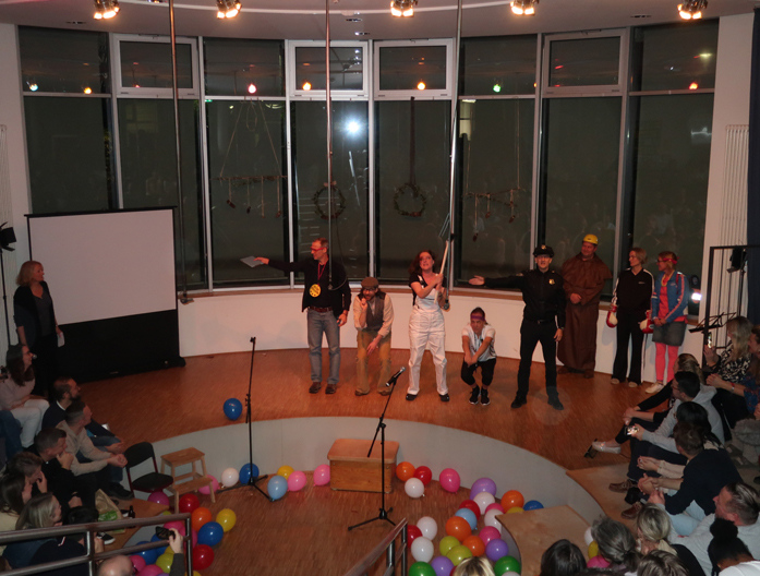 Um 19:30 versammelten sich über 100 Eltern plus Lehrkräfte und MitarbeiterInnen der Mosaik-Schule im Forum. Einige Eltern aus jeder Klasse 2 bis 4 hatten wieder über Wochen tolle Stücke geprobt, um sie nun in einer mitreißenden Vorstellung nacheinander vorzuführen. Wie einfallsreich die Eltern dabei waren zeigt die Fotogalerie. Ganz großen Dank für dieses kreative Engagement. Und anschließend ging es zum Abrocken und Weiterfeiern ins Fachwerk.