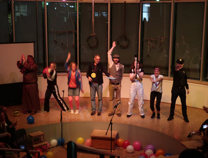 Um 19:30 versammelten sich über 100 Eltern plus Lehrkräfte und MitarbeiterInnen der Mosaik-Schule im Forum. Einige Eltern aus jeder Klasse 2 bis 4 hatten wieder über Wochen tolle Stücke geprobt, um sie nun in einer mitreißenden Vorstellung nacheinander vorzuführen. Wie einfallsreich die Eltern dabei waren zeigt die Fotogalerie. Ganz großen Dank für dieses kreative Engagement. Und anschließend ging es zum Abrocken und Weiterfeiern ins Fachwerk.