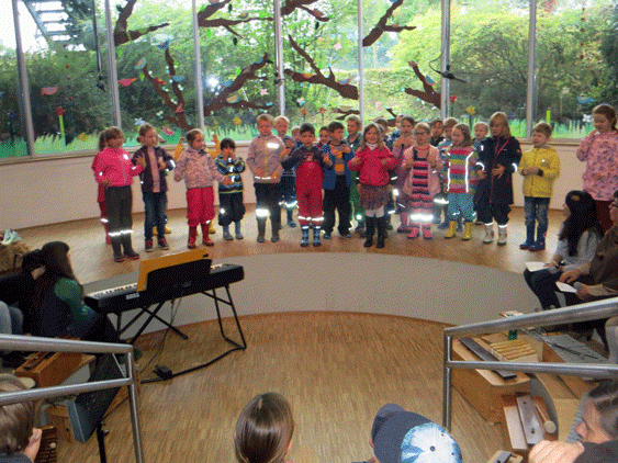 Anschließend treffen sich große und kleine Mosaikler im Forum für das herbstliche Ernte-Dank-Fest, das die 1. und 4. Klassen vorbereitet haben. Die Fotos lassen erahnen wie bunt und abwechslungsreich es dabei zuging.