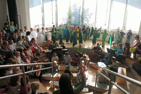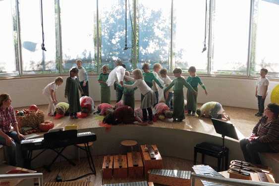 Gestaltet wurde das Erntedank-Fest wie immer von den  4. Klassen und den 1. Klassen, die dann ihren ersten großen Auftritt im Forum haben. Es war ein buntes, abwechslungsreiches, musikalisches Programm.