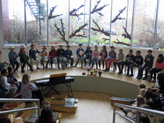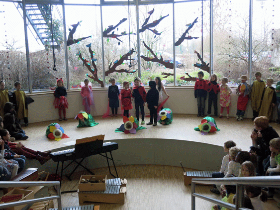 Das Fest ab 11:00 Uhr haben dieses Jahr die Klassen 1 und 4 emsig vorbereitet und dabei ein sehr buntes, abwechslungsreiches, ruhig-besinnliches sowie fetzig-schnelles Programm aufgeführt. Ein herzliches Dankeschön an die Kinder und die Lehrerinnen für ihren Einsatz!