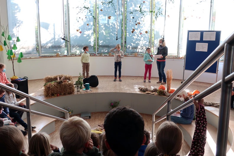 Dafür hatten die Kinder wie früher passende Herbst-Beiträge vorbereitet: Gedichte, Texte, Lieder, Raps, Tänze oder Theaterstücke. Und endlich konnten die Kinder wieder dieses tolle Gefühl des großen Applauses im Forum erleben – die Kinder des ersten Schuljahres und im Grunde auch des zweiten Schuljahres zum ersten Mal.