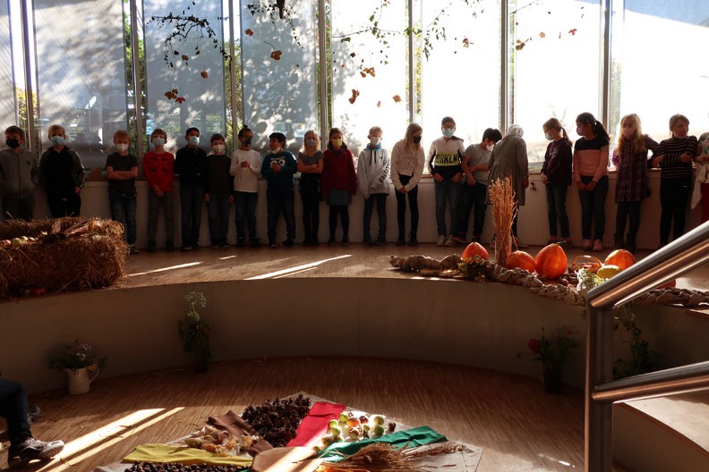 Am Freitag, den 08.10.21, dem letzten Tag vor den Herbstferien fand endlich wieder etwas von unserem Forum-Schulleben statt. Nicht alle Mosaik-Kinder auf einmal, aber zumindest jeder Jahrgang feierte ein Herbstfest im Forum.