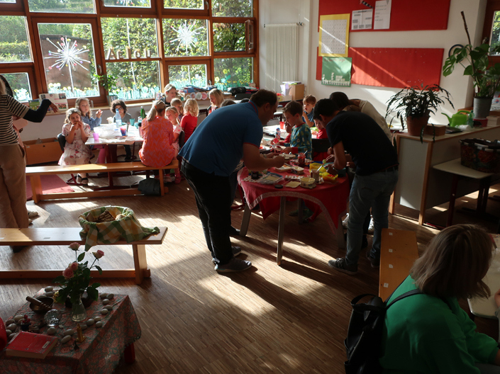 Freitag, 29.09.23, unser Herbstfest wie früher! Nach einem Frühstück mit den Eltern in den Klassen feierten wir im Forum ab 11:00 Uhr das Herbstfest, vorbereitet und gestaltet von den Klassen 1 und 4 und endlich wieder mit vollem Haus – wie die Bilder unten zeigen!