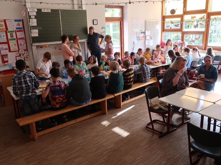 Freitag, 29.09.23, unser Herbstfest wie früher! Nach einem Frühstück mit den Eltern in den Klassen feierten wir im Forum ab 11:00 Uhr das Herbstfest, vorbereitet und gestaltet von den Klassen 1 und 4 und endlich wieder mit vollem Haus – wie die Bilder unten zeigen!