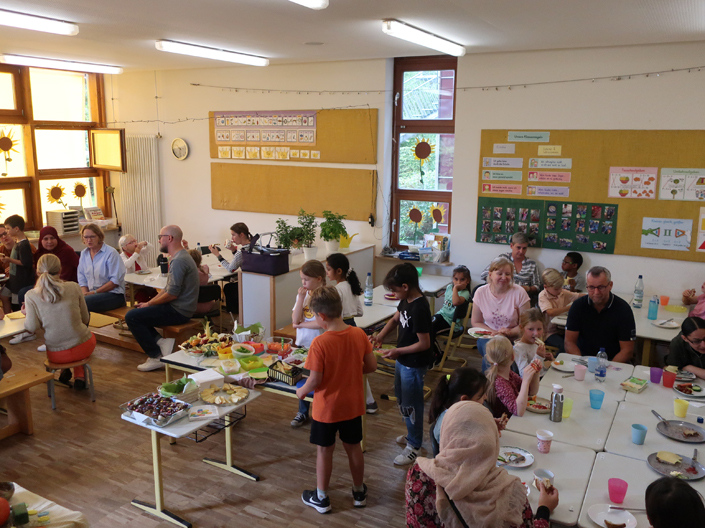 Freitag, 29.09.23, unser Herbstfest wie früher! Nach einem Frühstück mit den Eltern in den Klassen feierten wir im Forum ab 11:00 Uhr das Herbstfest, vorbereitet und gestaltet von den Klassen 1 und 4 und endlich wieder mit vollem Haus – wie die Bilder unten zeigen!