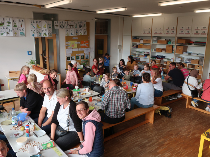 Freitag, 29.09.23, unser Herbstfest wie früher! Nach einem Frühstück mit den Eltern in den Klassen feierten wir im Forum ab 11:00 Uhr das Herbstfest, vorbereitet und gestaltet von den Klassen 1 und 4 und endlich wieder mit vollem Haus – wie die Bilder unten zeigen!