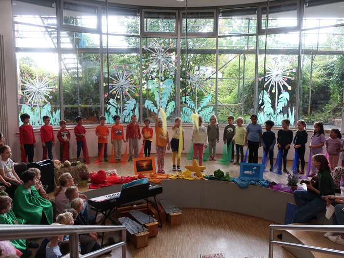 Freitag, 29.09.23, unser Herbstfest wie früher! Nach einem Frühstück mit den Eltern in den Klassen feierten wir im Forum ab 11:00 Uhr das Herbstfest, vorbereitet und gestaltet von den Klassen 1 und 4 und endlich wieder mit vollem Haus – wie die Bilder unten zeigen!