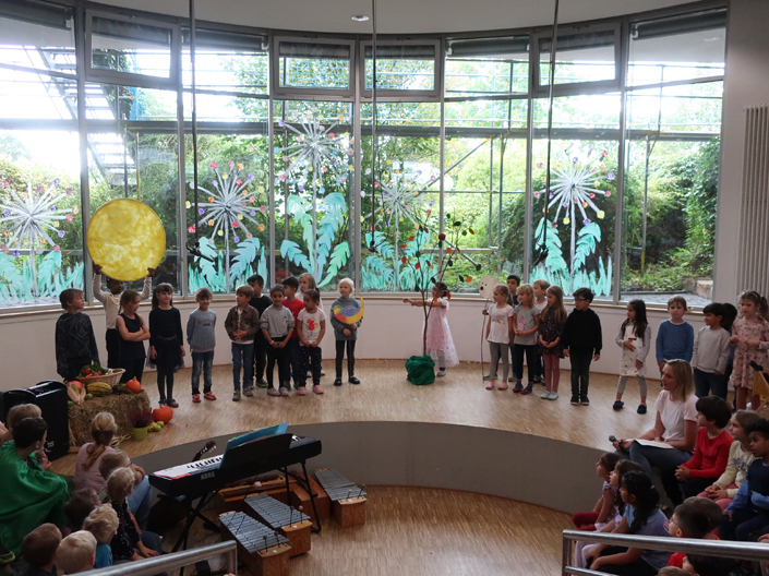 Freitag, 29.09.23, unser Herbstfest wie früher! Nach einem Frühstück mit den Eltern in den Klassen feierten wir im Forum ab 11:00 Uhr das Herbstfest, vorbereitet und gestaltet von den Klassen 1 und 4 und endlich wieder mit vollem Haus – wie die Bilder unten zeigen!