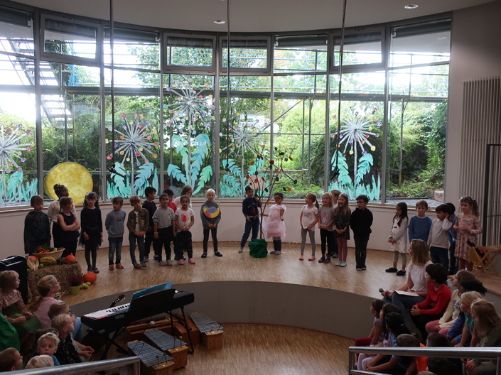 Freitag, 29.09.23, unser Herbstfest wie früher! Nach einem Frühstück mit den Eltern in den Klassen feierten wir im Forum ab 11:00 Uhr das Herbstfest, vorbereitet und gestaltet von den Klassen 1 und 4 und endlich wieder mit vollem Haus – wie die Bilder unten zeigen!