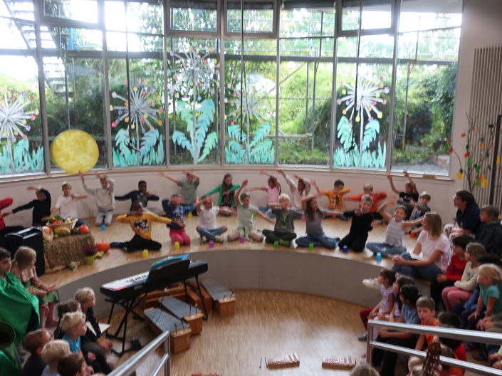 Freitag, 29.09.23, unser Herbstfest wie früher! Nach einem Frühstück mit den Eltern in den Klassen feierten wir im Forum ab 11:00 Uhr das Herbstfest, vorbereitet und gestaltet von den Klassen 1 und 4 und endlich wieder mit vollem Haus – wie die Bilder unten zeigen!