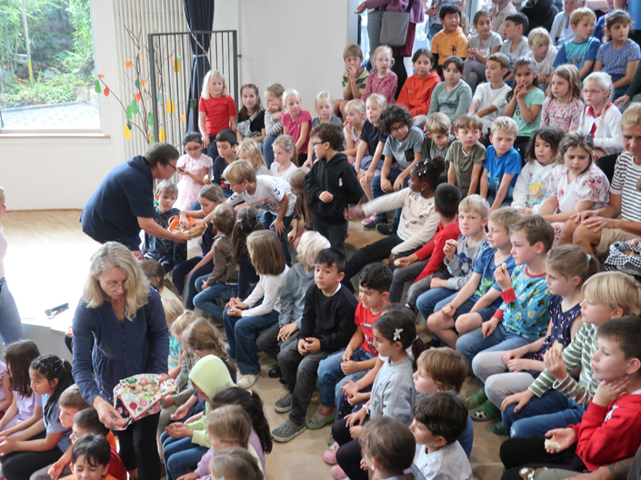 Freitag, 29.09.23, unser Herbstfest wie früher! Nach einem Frühstück mit den Eltern in den Klassen feierten wir im Forum ab 11:00 Uhr das Herbstfest, vorbereitet und gestaltet von den Klassen 1 und 4 und endlich wieder mit vollem Haus – wie die Bilder unten zeigen!