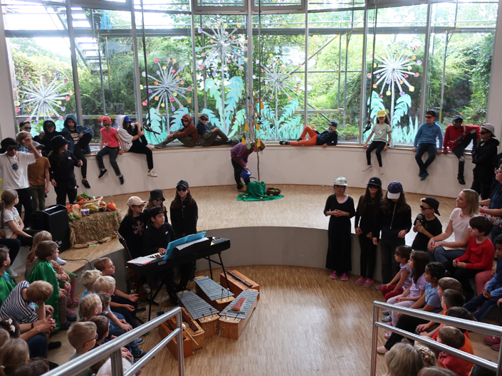 Freitag, 29.09.23, unser Herbstfest wie früher! Nach einem Frühstück mit den Eltern in den Klassen feierten wir im Forum ab 11:00 Uhr das Herbstfest, vorbereitet und gestaltet von den Klassen 1 und 4 und endlich wieder mit vollem Haus – wie die Bilder unten zeigen!