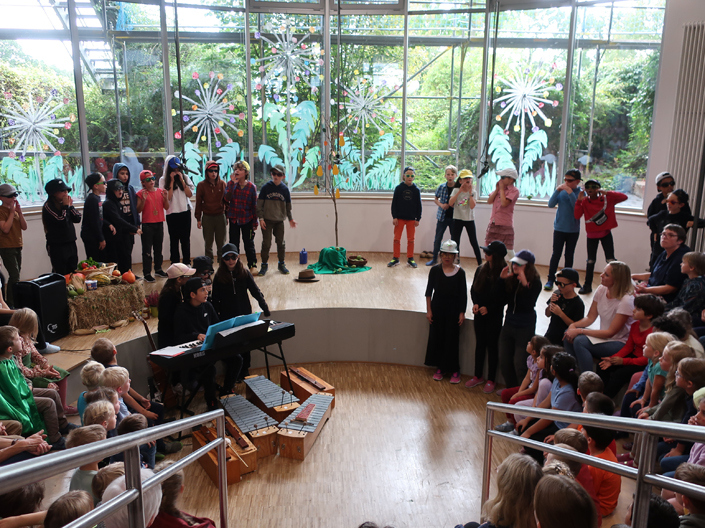 Freitag, 29.09.23, unser Herbstfest wie früher! Nach einem Frühstück mit den Eltern in den Klassen feierten wir im Forum ab 11:00 Uhr das Herbstfest, vorbereitet und gestaltet von den Klassen 1 und 4 und endlich wieder mit vollem Haus – wie die Bilder unten zeigen!