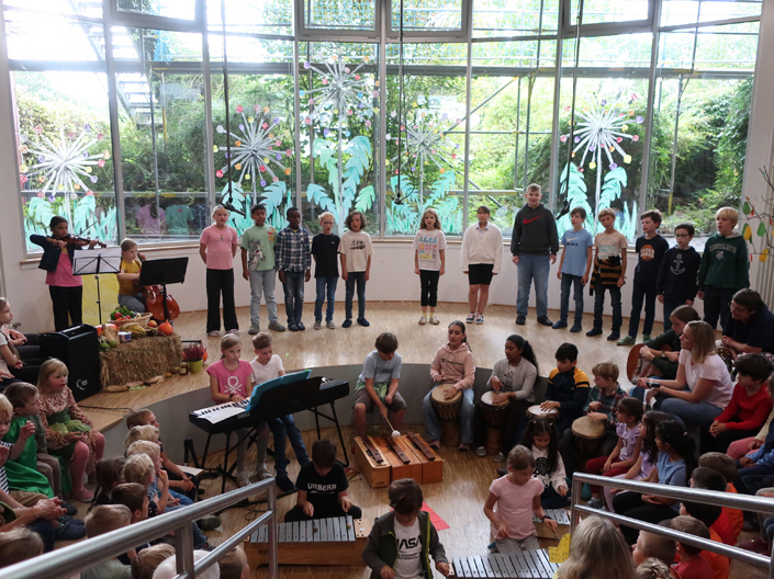 Freitag, 29.09.23, unser Herbstfest wie früher! Nach einem Frühstück mit den Eltern in den Klassen feierten wir im Forum ab 11:00 Uhr das Herbstfest, vorbereitet und gestaltet von den Klassen 1 und 4 und endlich wieder mit vollem Haus – wie die Bilder unten zeigen!