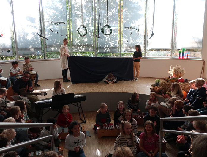 Das einstündige Programm hatten die Klassen 4 und 1 vorbereitet. Für die Erstis ein besonders spannender Moment, da sie zum ersten Mal auf der großen Bühne im Forum standen. Und das Forum war richtig voll, denn vor dem Herbstfest waren viele Eltern bereits zum Ernte-Dank-Frühstück in die Klassen gekommen. Danke für die Unterstützung dabei!