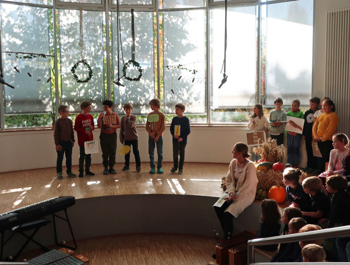 Das einstündige Programm hatten die Klassen 4 und 1 vorbereitet. Für die Erstis ein besonders spannender Moment, da sie zum ersten Mal auf der großen Bühne im Forum standen. Und das Forum war richtig voll, denn vor dem Herbstfest waren viele Eltern bereits zum Ernte-Dank-Frühstück in die Klassen gekommen. Danke für die Unterstützung dabei!