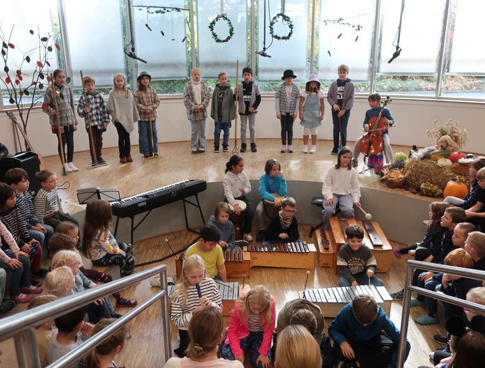 Das einstündige Programm hatten die Klassen 4 und 1 vorbereitet. Für die Erstis ein besonders spannender Moment, da sie zum ersten Mal auf der großen Bühne im Forum standen. Und das Forum war richtig voll, denn vor dem Herbstfest waren viele Eltern bereits zum Ernte-Dank-Frühstück in die Klassen gekommen. Danke für die Unterstützung dabei!