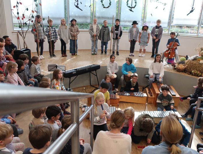 Das einstündige Programm hatten die Klassen 4 und 1 vorbereitet. Für die Erstis ein besonders spannender Moment, da sie zum ersten Mal auf der großen Bühne im Forum standen. Und das Forum war richtig voll, denn vor dem Herbstfest waren viele Eltern bereits zum Ernte-Dank-Frühstück in die Klassen gekommen. Danke für die Unterstützung dabei!